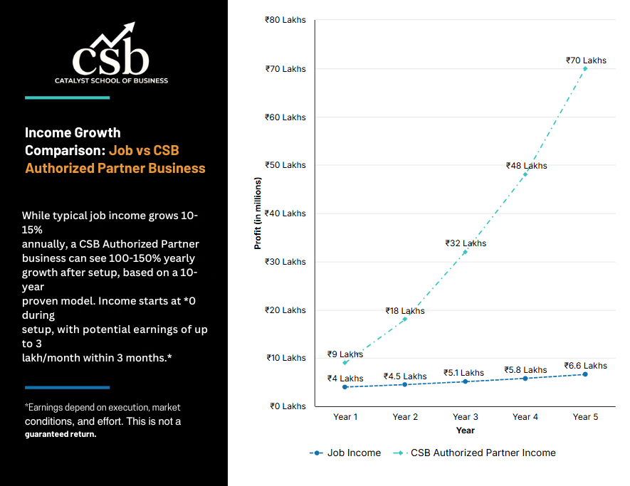 However, once operational, the income curve accelerates rapidly. Within three months, partners can start earning up to ₹3 lakh per month depending on execution, local demand, and effort. Over the years, income shows 100% to 150% year-on-year growth potential, unlike jobs where growth remains capped.