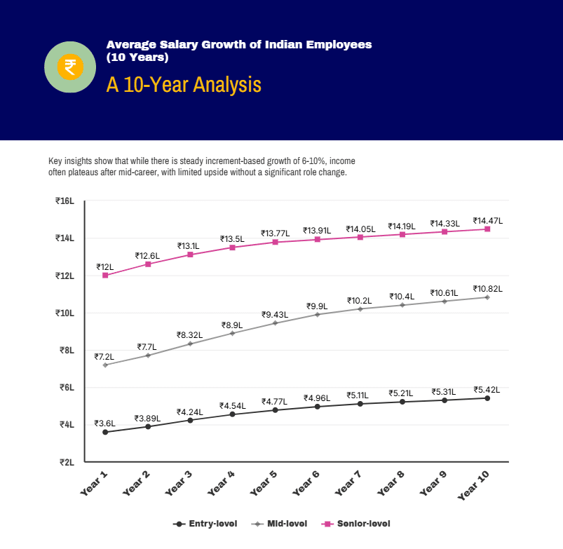 The data shows a consistent but slow upward movement. Entry-level professionals start around ₹3.6 lakh annually and reach approximately ₹5.4 lakh after a decade. Mid-level professionals grow from roughly ₹7.2 lakh to ₹10.8 lakh. Senior-level professionals increase from around ₹12 lakh to ₹14.5 lakh.