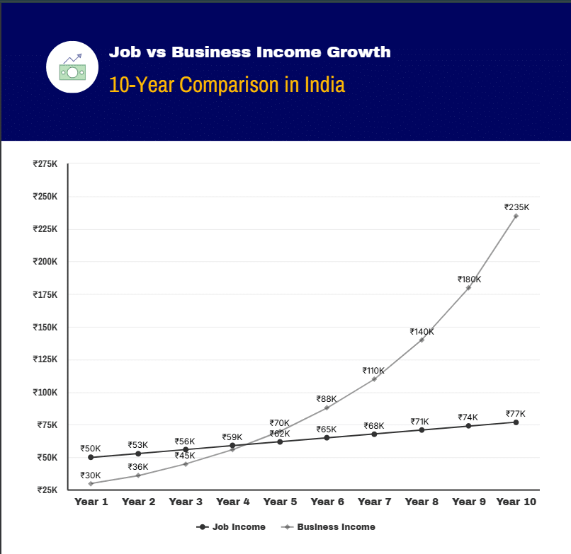 Job vs business income growth is one of the most discussed questions among working professionals in India today. While jobs offer stability, businesses promise scalability. But beyond opinions and motivation, what does the data actually say?